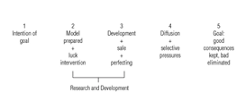 Jencks also proposes a ‘Model for teleological development’ — a five-stage process through which an intention in the mind of the architect or designer goes on to achieve fruition. through which an intention in the mind of the architect or designer goes on to achieve fruition. The first step according to Jencks is the conception of an intention of a final goal in the mind of the architect or designer. The designer then would survey the possible solutions and build up various models to substantiate his claim, further, with or without luck the designer would have to create, invent or discover a new solution to the problem he is trying to address. This solution will then compete with other solutions, continue a process of refinement and perfection and will be ultimately evaluated both for its good and bad consequences.